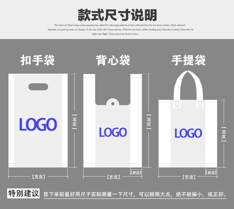 Note: The following specifications and sizes are for reference only – custom sizes are available to fit your specific needs! Regarding thickness: standard thickness is 3~3.5 silk, medium thickness is 4 silk, national standard is 5 silk, and brand chain supermarkets like Carrefour adopt ultra-national standard thickness of approximately 5.5 silk. (Plastic bag thickness is measured in "silk", with 1 silk = 0.01 mm.) Single-sided, single-color printing is recommended to shorten production lead time.
